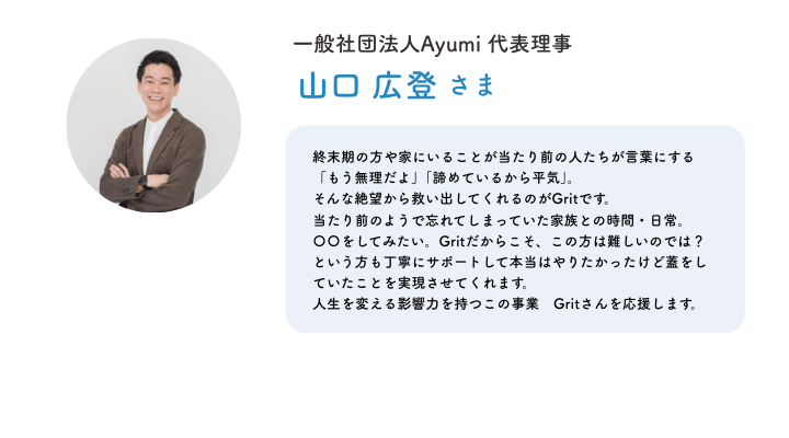 このクラウドファンディングに向けて、日頃からGritの活動を応援してくださっている関係者の皆さまより、力強いメッセージをいただきました。
